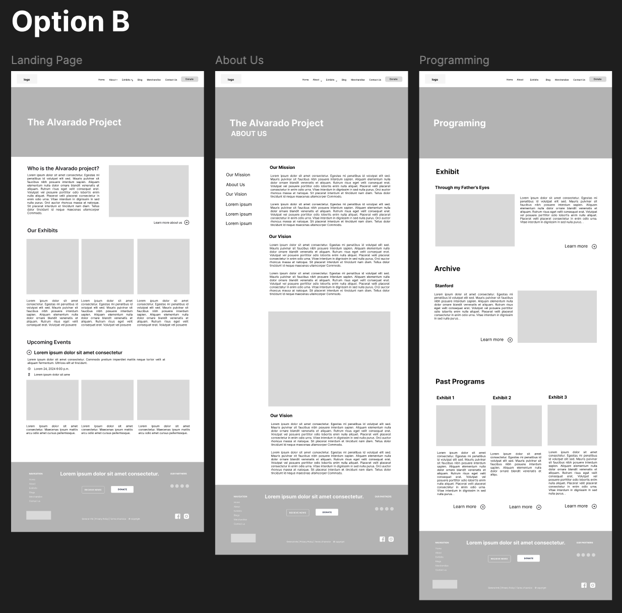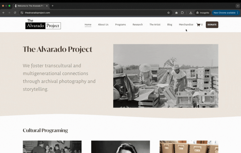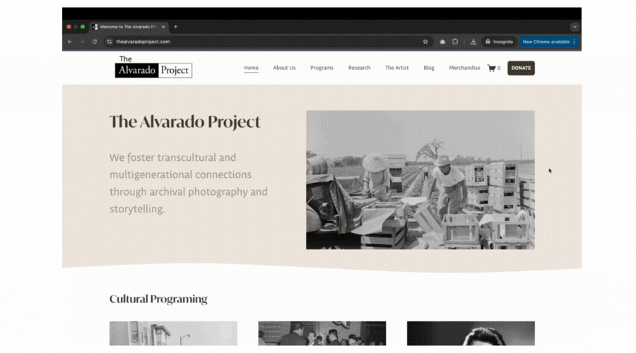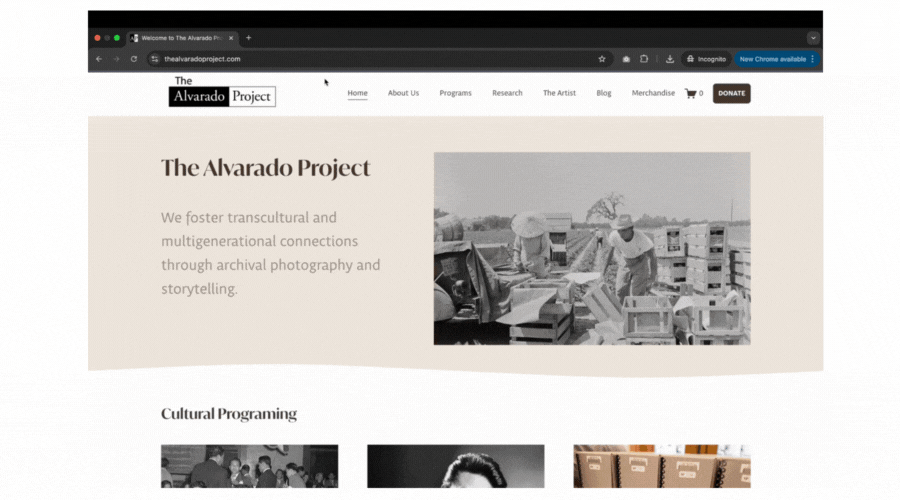 I separated the nonprofit’s work from Ricardo Alvarado’s artist story, creating clear sections for the organization, exhibits, and the archive.