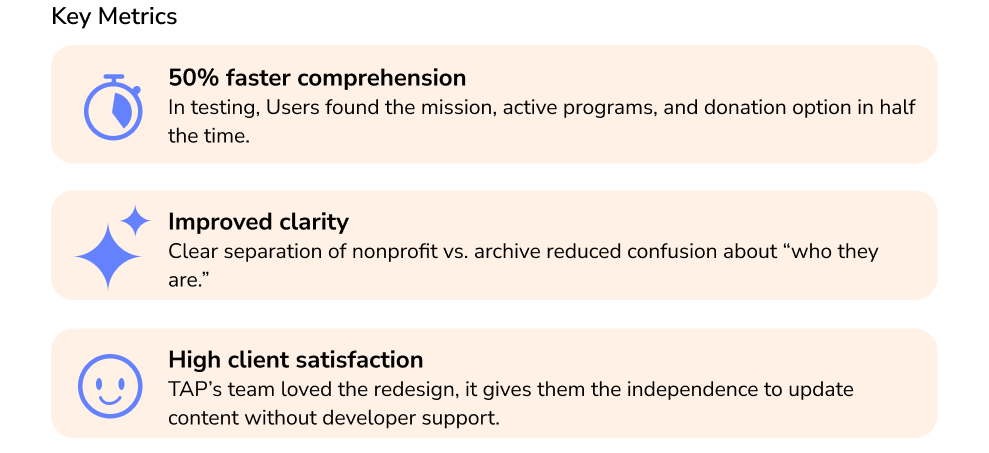 This project was more than just fixing a broken site; it was about empowering a grassroots nonprofit to tell its story with clarity and confidence. By separating TAP’s mission from the artist’s legacy, simplifying navigation, and surfacing key actions like Donate and Shop, the redesign delivered a site that better supports their outreach and fundraising goals.