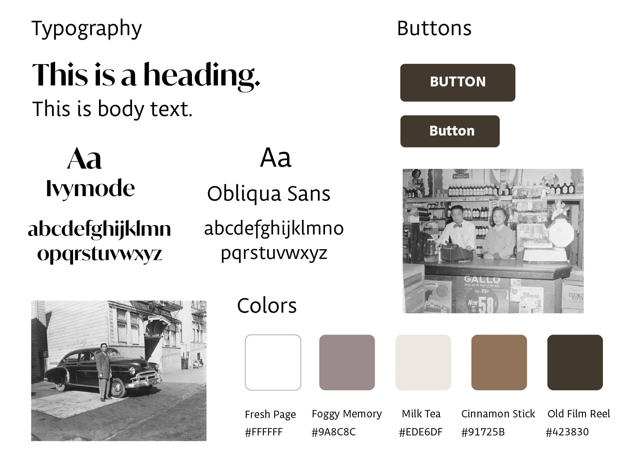 Warm neutrals with soft accents, chosen to complement archival photography and convey community.
