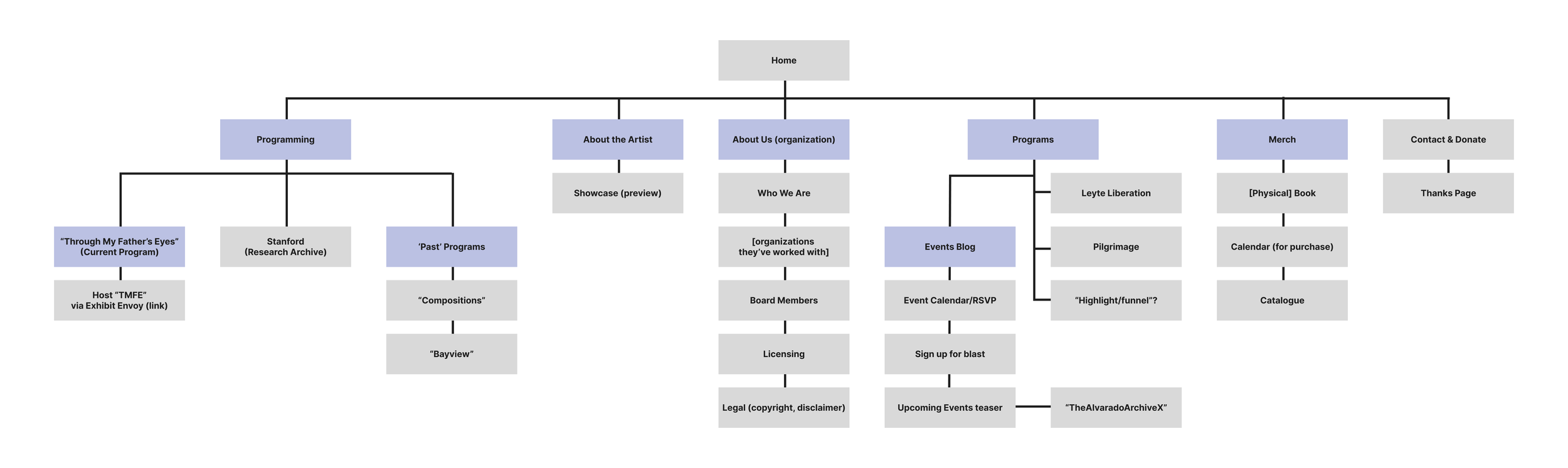 I built a clean, easy-to-follow site map with clear paths to explore programs, learn about the artist, and support the organization.