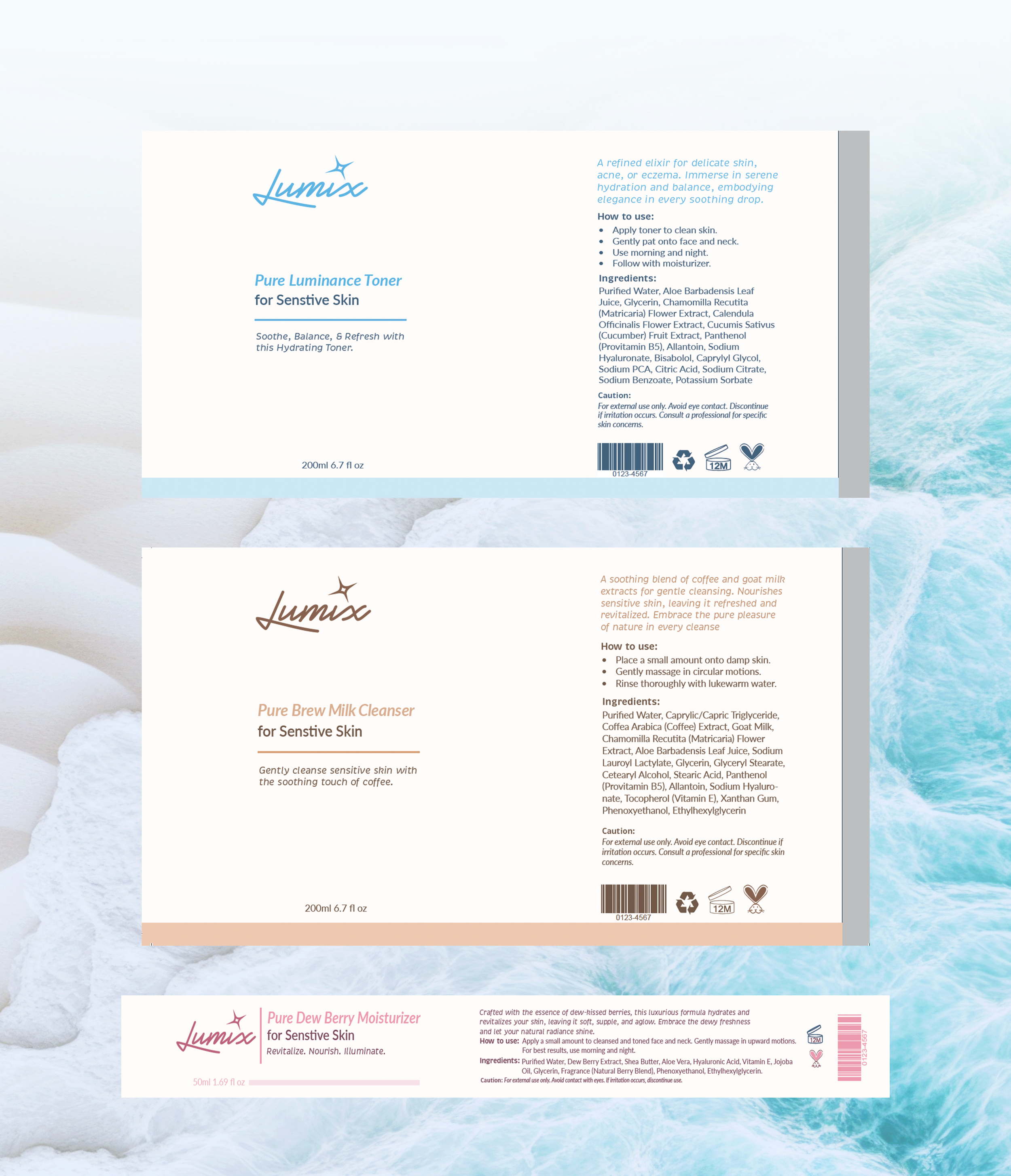 Designing Lumix was all about finding that balance between gentle and luxe. I wanted the brand to feel calming and trustworthy, like something you’d actually want to use on sensitive skin. I drew inspiration from textures like water and soft light, and tried to make everything feel cohesive, from the labels to the social media posts.
