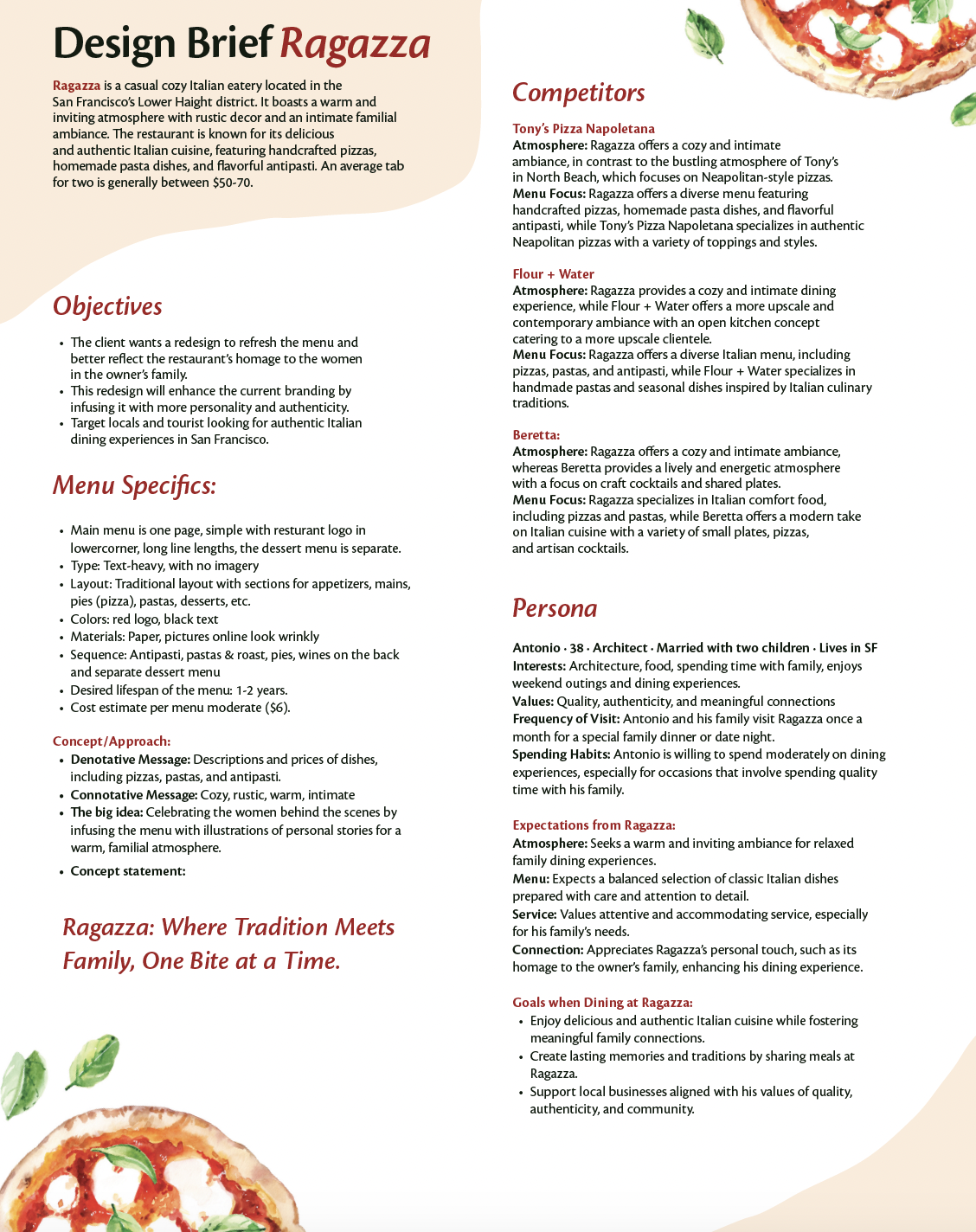 For this project, I was tasked to create a menu that guides diners effortlessly through appetizers, mains, and desserts, while honoring the owner’s story and neighborhood charm.